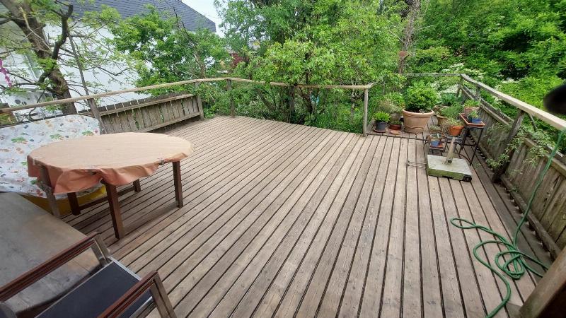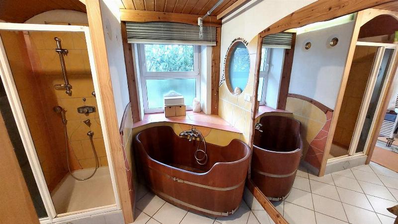 Obergeschoss: Offene Küche mit Essbereich und Wohnzimmer, ergänzt durch eine wunderschöne ca. 17 m² Terrasse mit Blick ins Grüne. Ein Badezimmer mit Sauna und zusätzliche 5 Zimmer stehen Ihnen zur Verfügung.